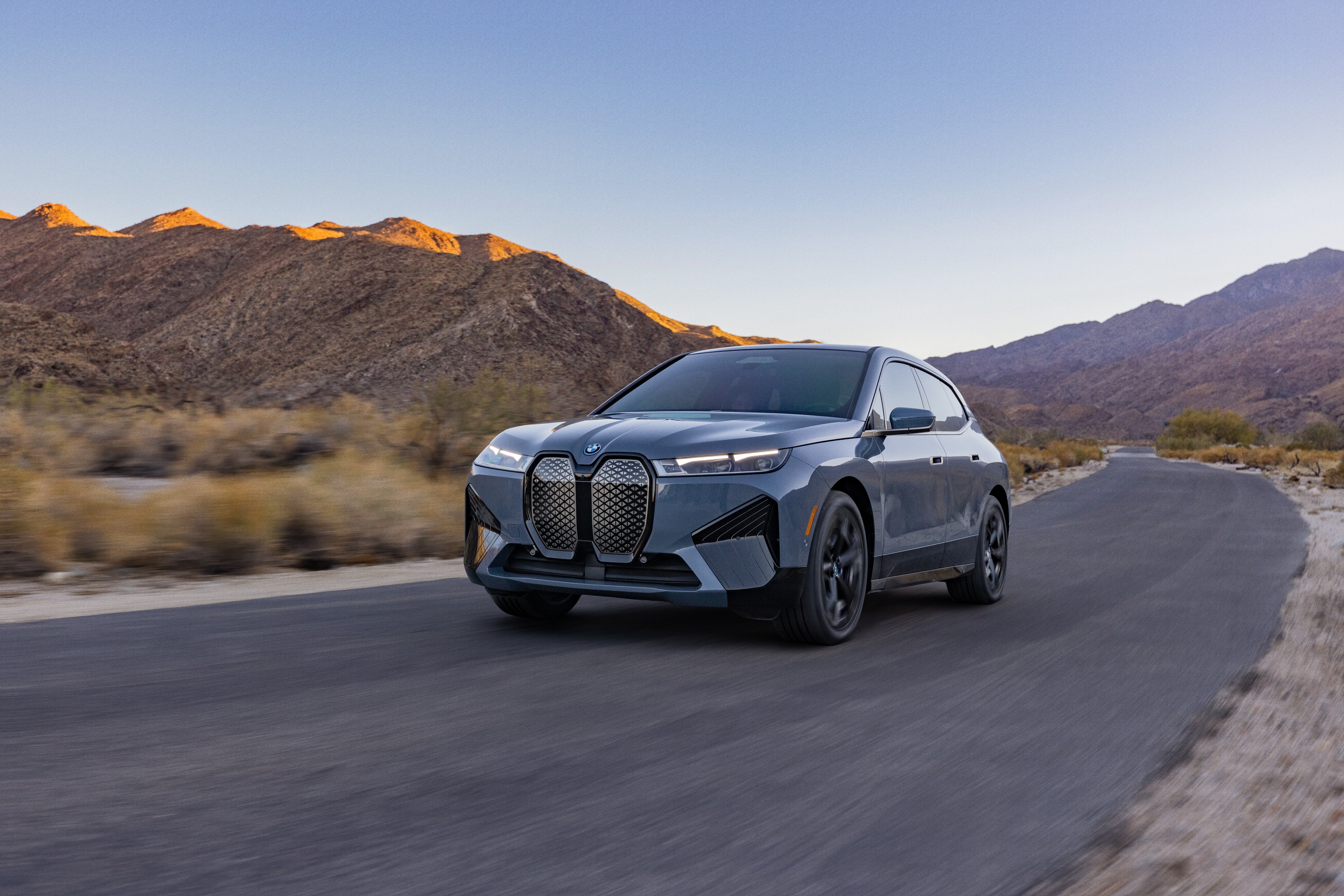 The all-new, fully electric BMW iX Sports Activity Vehicle as it appears in a new BMW Super Bowl advertisement starring Arnold Schwarzenegger and Salma Hayek Pinault as the Greek gods Zeus and Hera. The BMW iX begins arriving at U.S. dealers in March 2022.