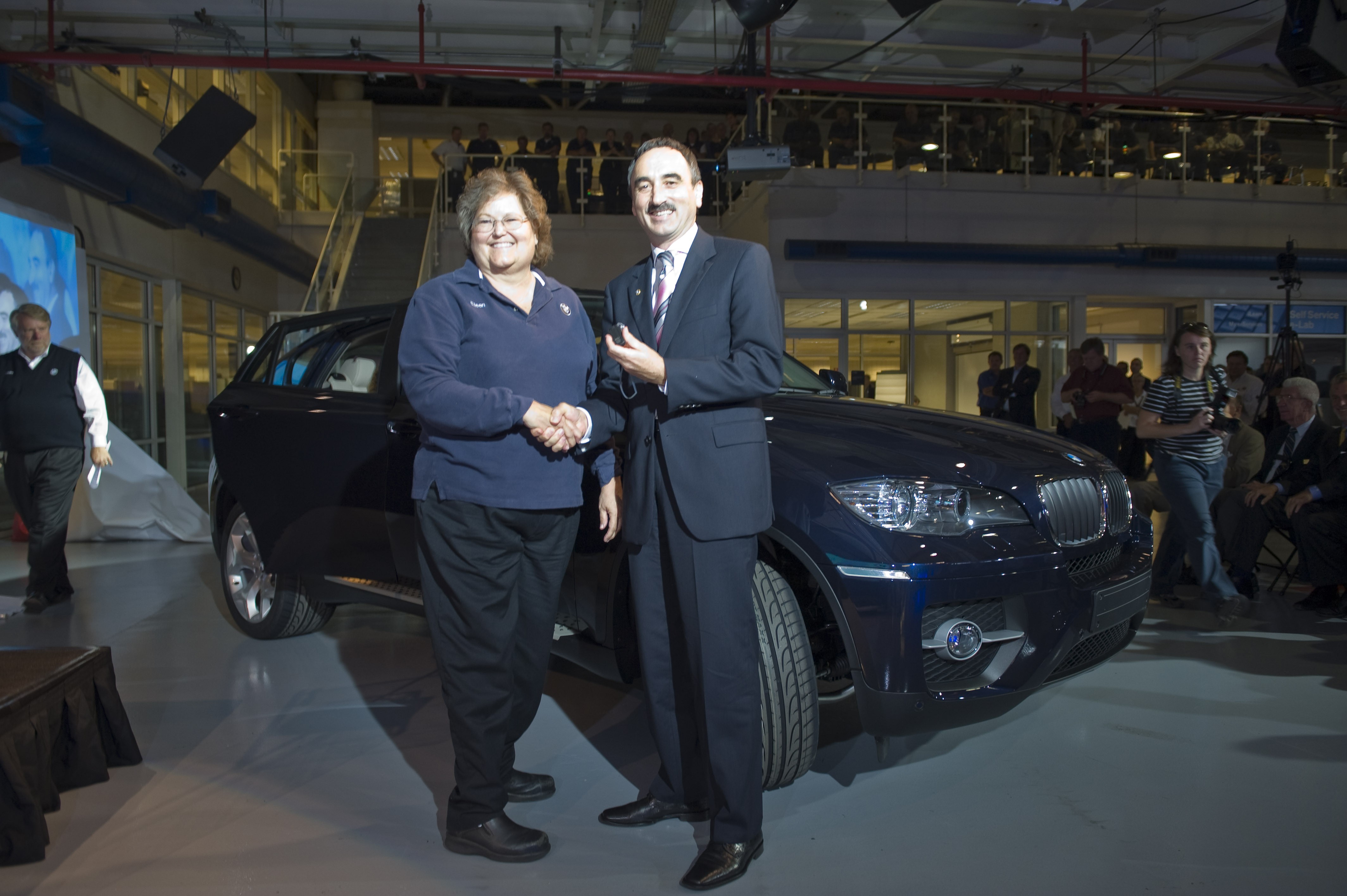 Josef Kerscher, President of BMW Manufacturing, receives the keys from Associate Eileen Huffman to the 1.5 millionth vehicle produced at BMW ...