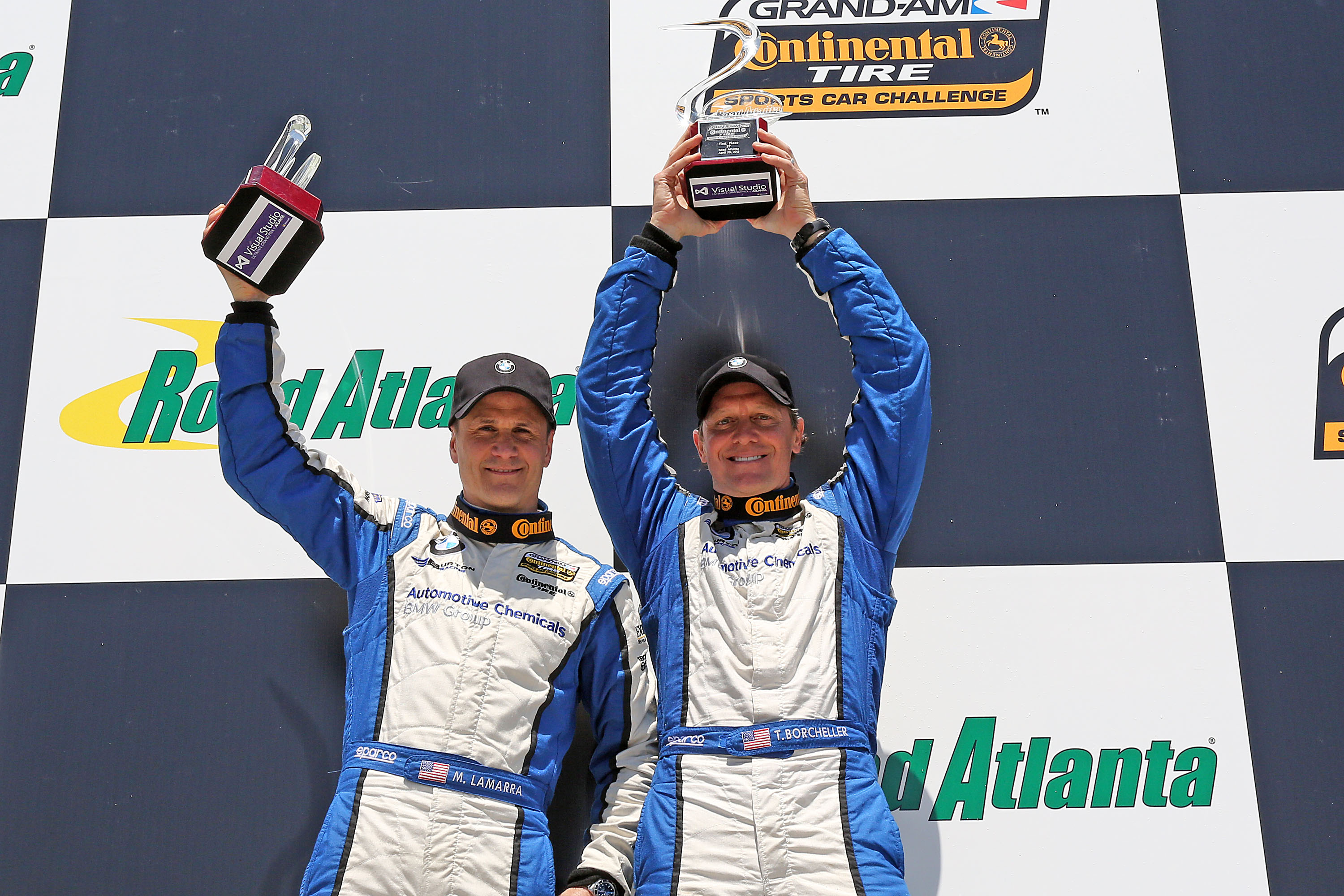 Mike LaMarra and Terry Borcheller (L-R) celebrate their win at Road Atlanta. (04/2013)
