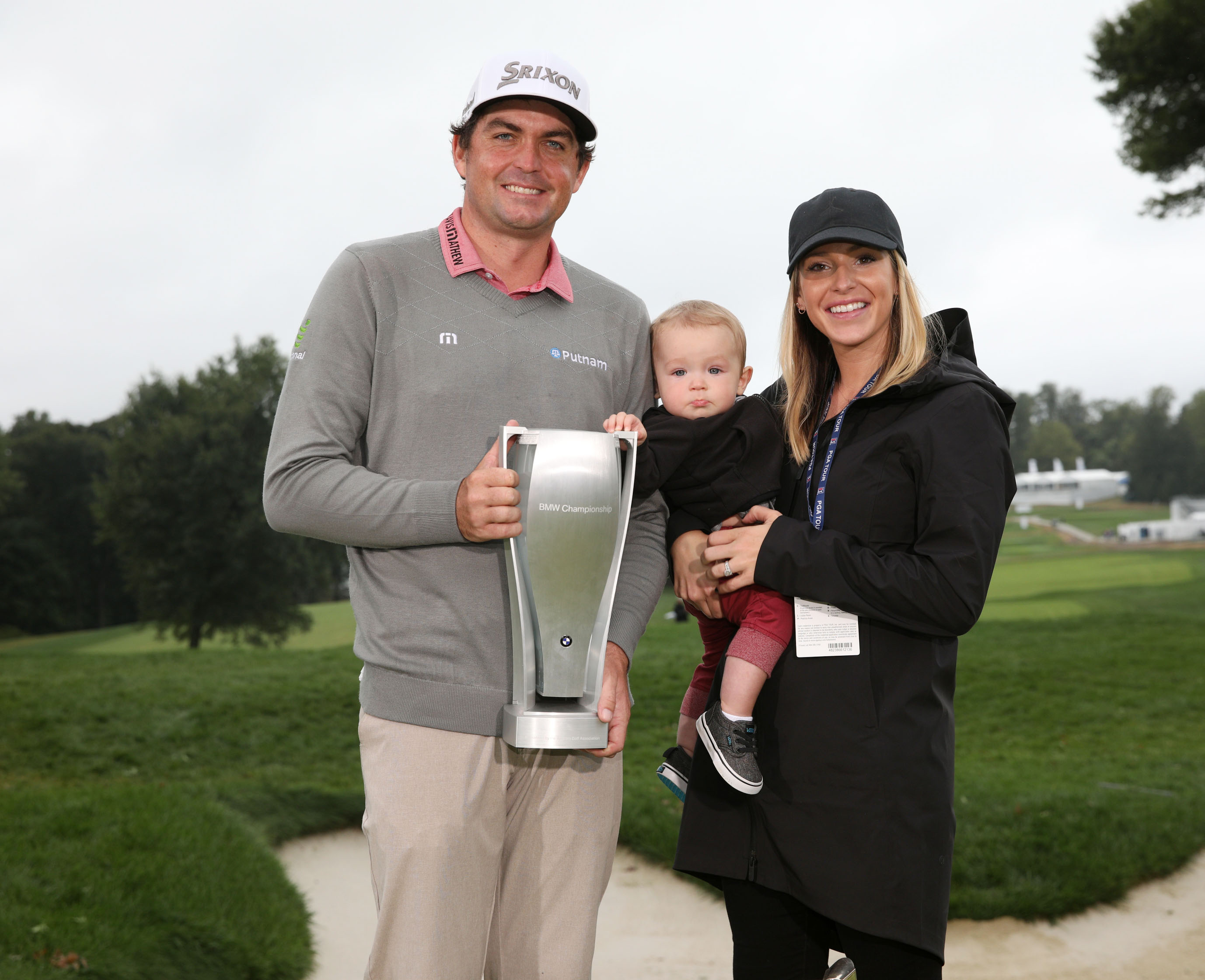 PGA TOUR pro Keegan Bradley holds the BMW Championship trophy alongside his wife, Jillian, and their son, Logan, following his victory at Aronimink Golf Club in Newtown Square, PA on Monday, September 10. The win was Bradley's first professional win in over six years. Photo Credit: WGA/Charles Cherney. (09/2018)