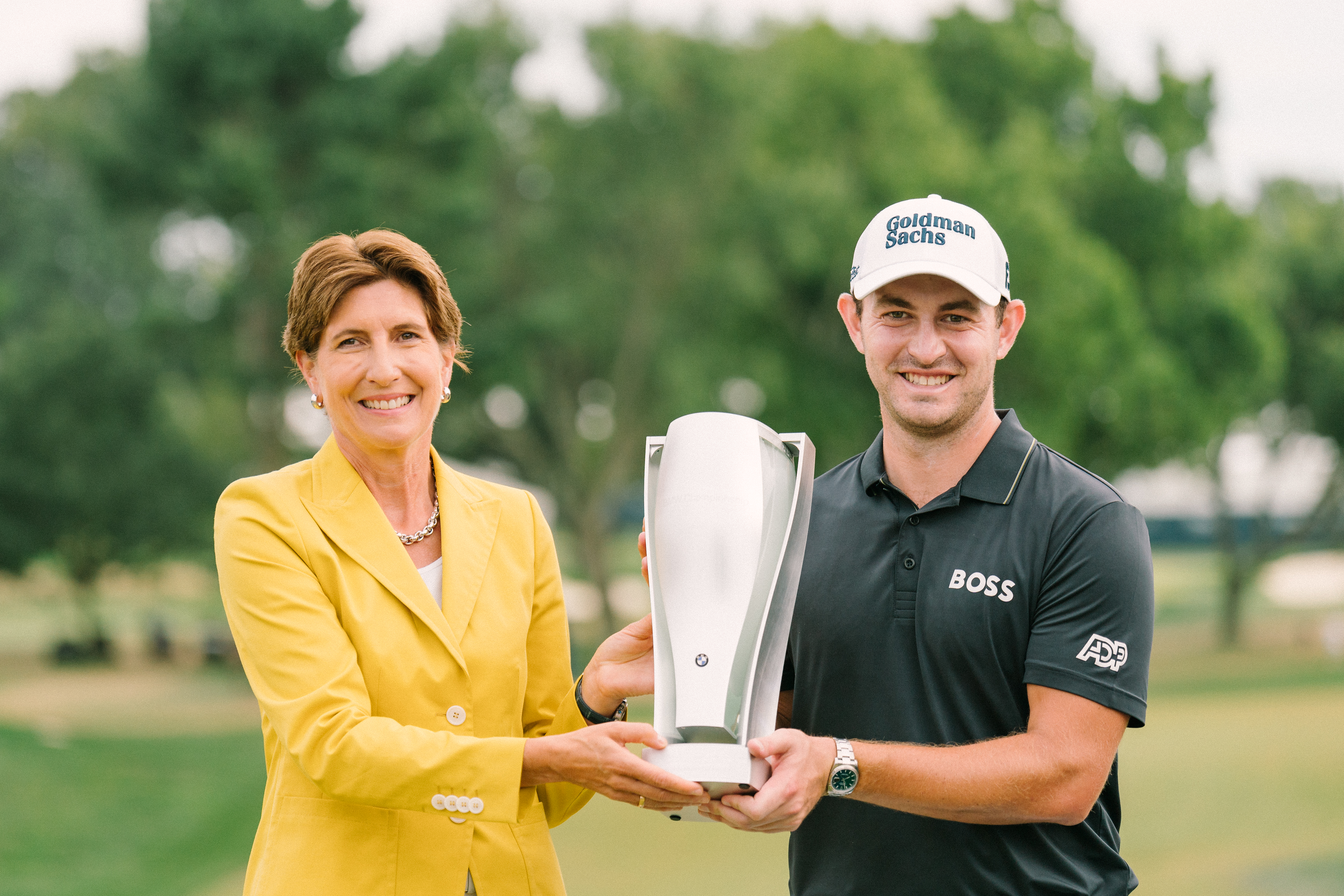 BMW Group Member of the Board of Management Ilka Horstmeier presents the BMW Championship Trophy to 2022 BMW Championship winner Patrick Cantlay on the 18th green at Wilmington Country Club in Wilmington, DE on August 21, 2022. All proceeds from the BMW Championship benefit the Evans Scholars Foundation, which provides full tuition and housing scholarships for hardworking young caddies Photo credit Christian Hafer.