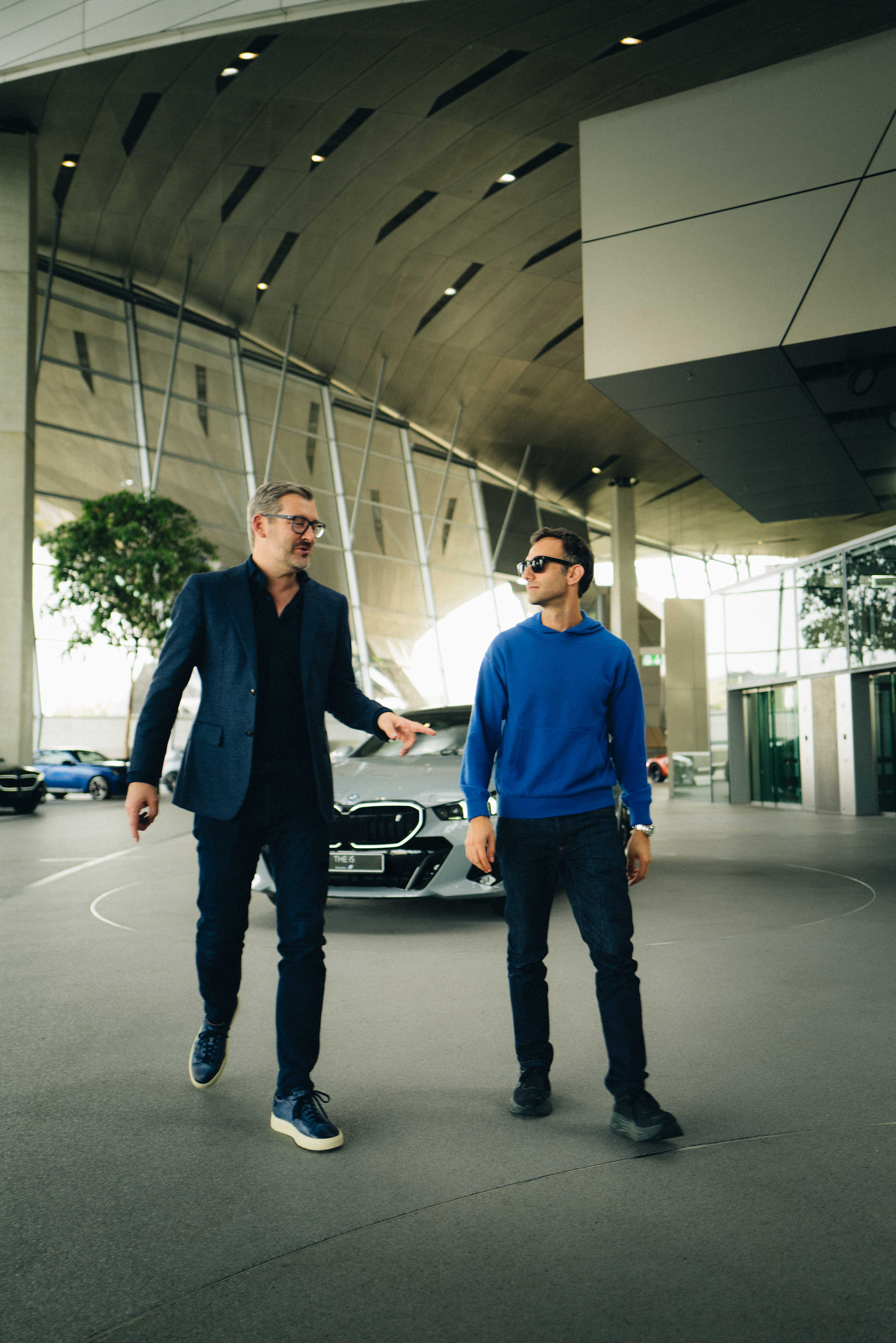 Domagoj Dukec (Head of BMW Design) and Alex Israel (artist) in front of the new 100% electric BMW i5. BMW Welt, Munich. Photo: Eileen Jordan (11/2023)