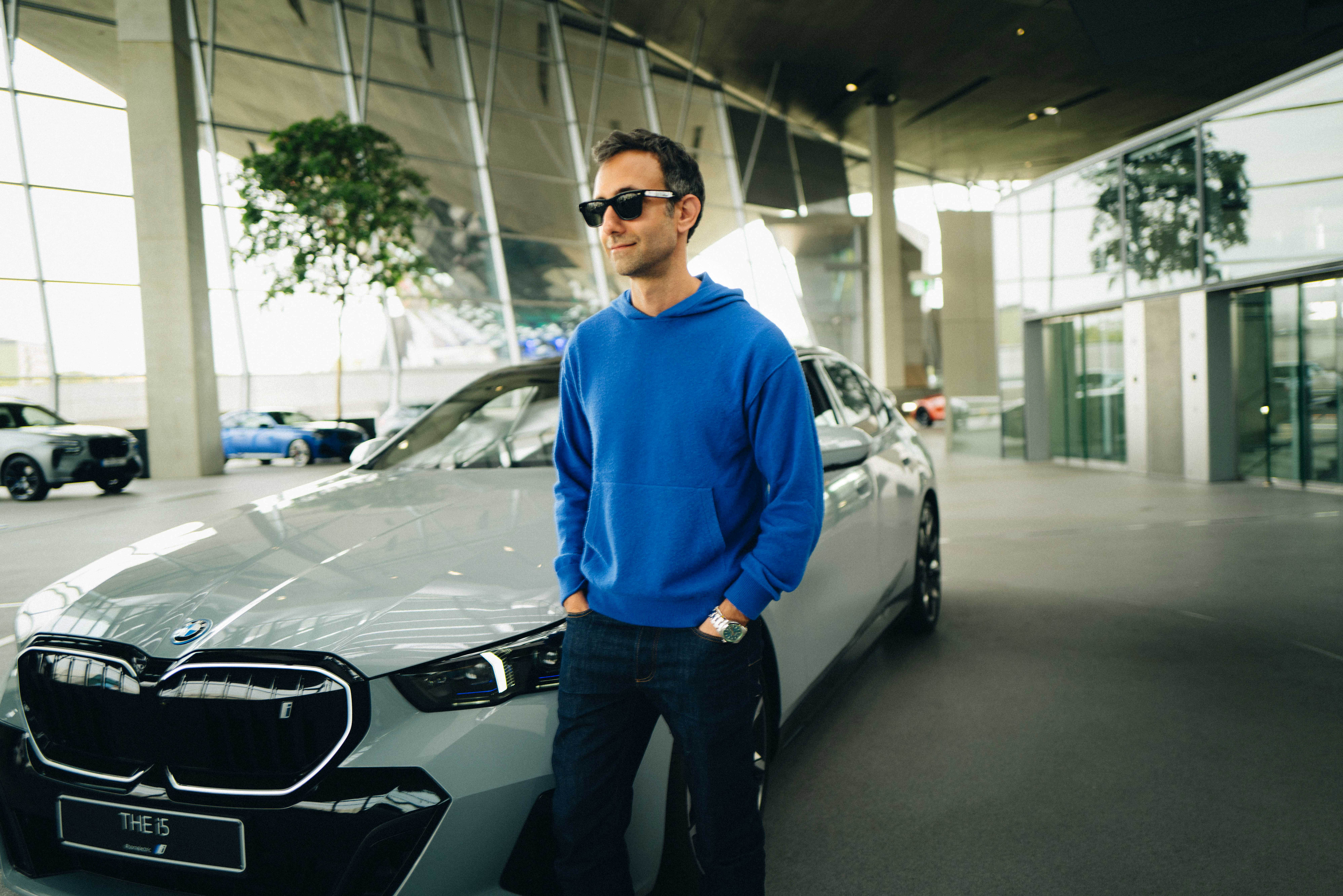 Artist Alex Israel and the new 100% electric BMW i5, inspiration for his AI video installation REMEMBR, to be unveiled at Art Basel in Miami Beach 2023. Photo: Eileen Jordan (11/2023)