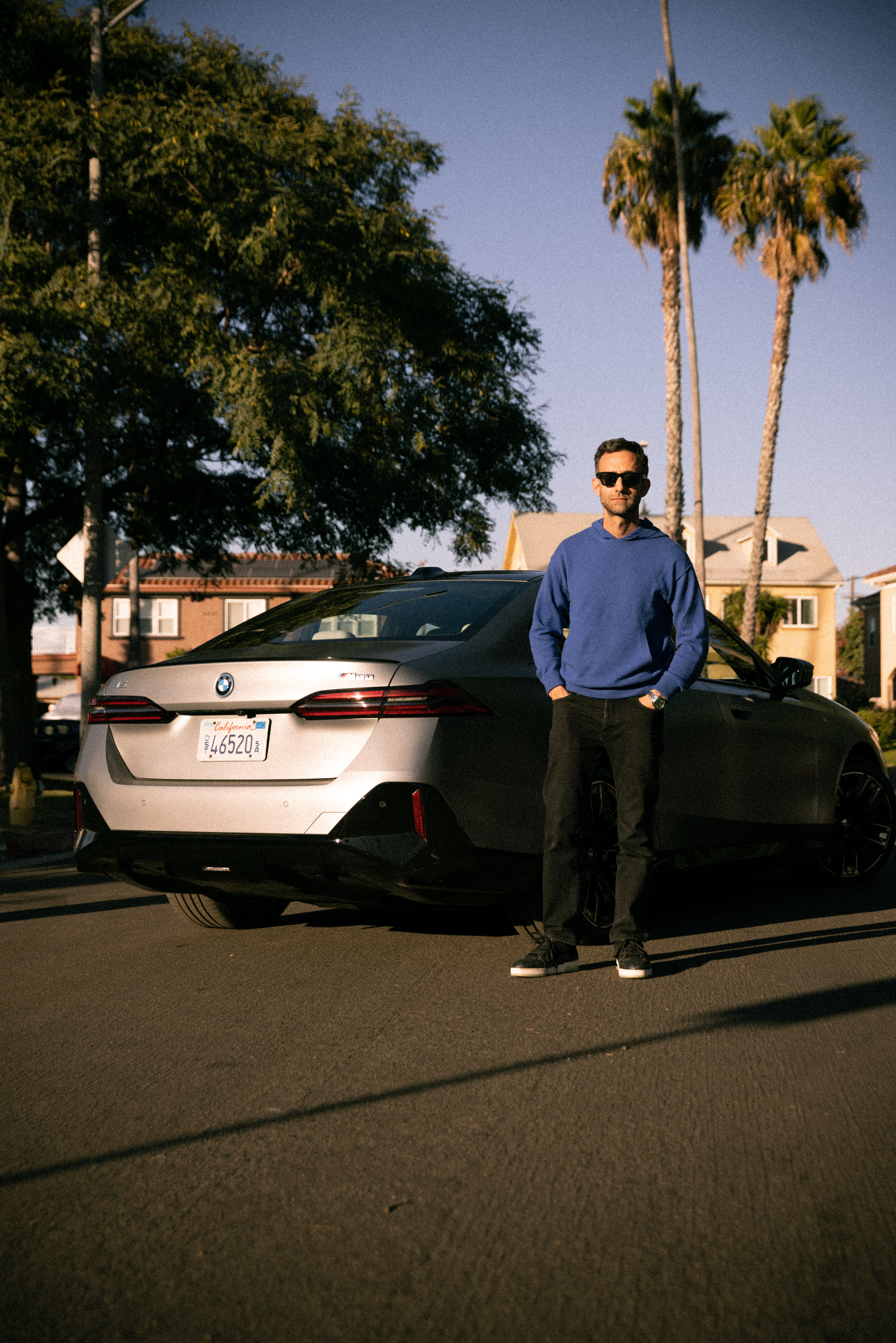 Artist Alex Israel in front of the new 100% electric BMW i5, inspiration for his AI video installation REMEMBR, to be unveiled at Art Basel in Miami Beach 2023. Photo: BDX MEDIA, Benjamin Diedering (11/2023)