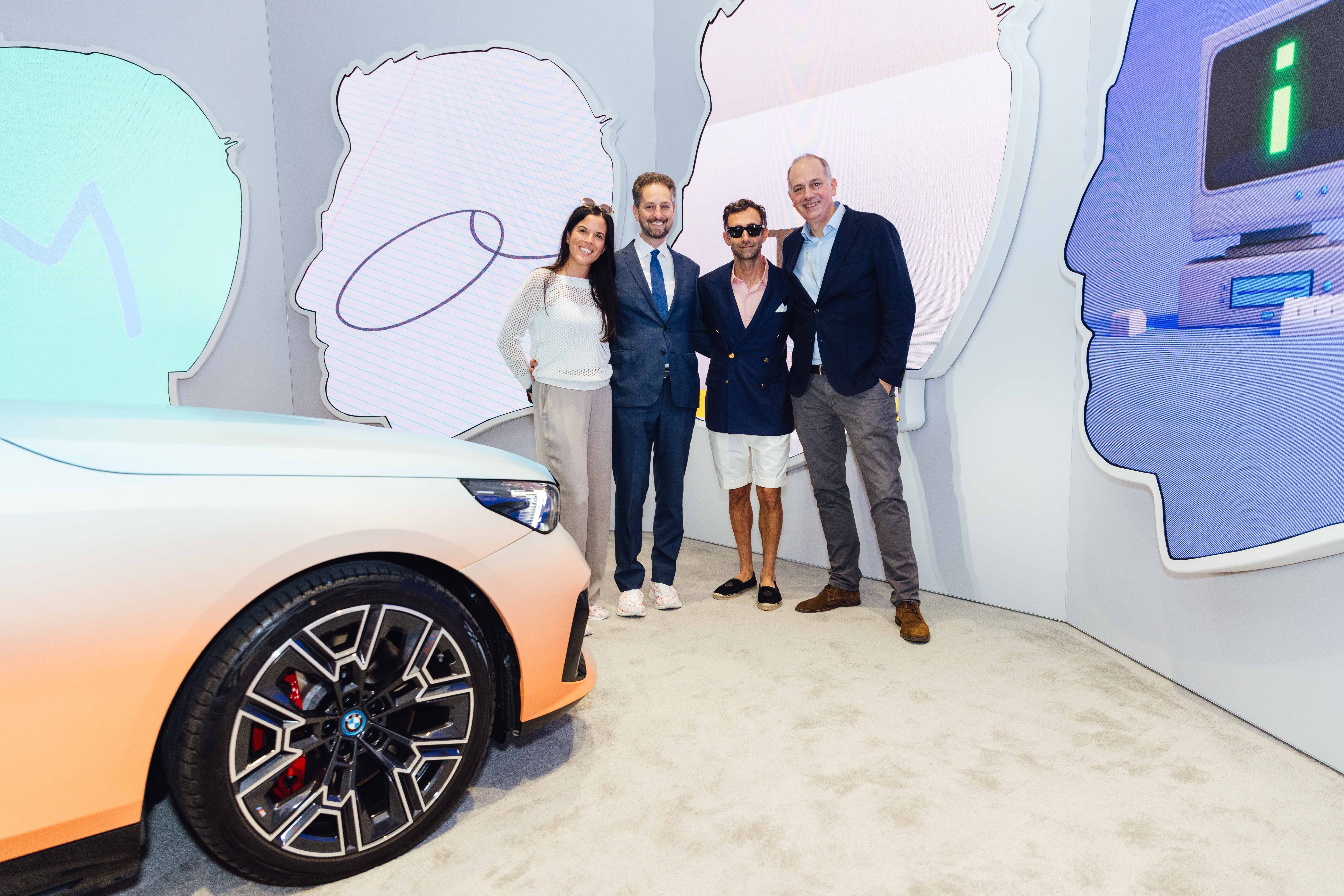 Opening Reception: REMEMBR at Art Basel in Miami Beach 2023. f.l.t.r.: Hedwig Solis Weinstein (Head of BMW Arts & Thought Leadership Collaborations), Noah Horowitz (CEO Art Basel), Alex Israel, Marcus Casey (Chief Marketing Officer, BMW of North America). (12/2023)