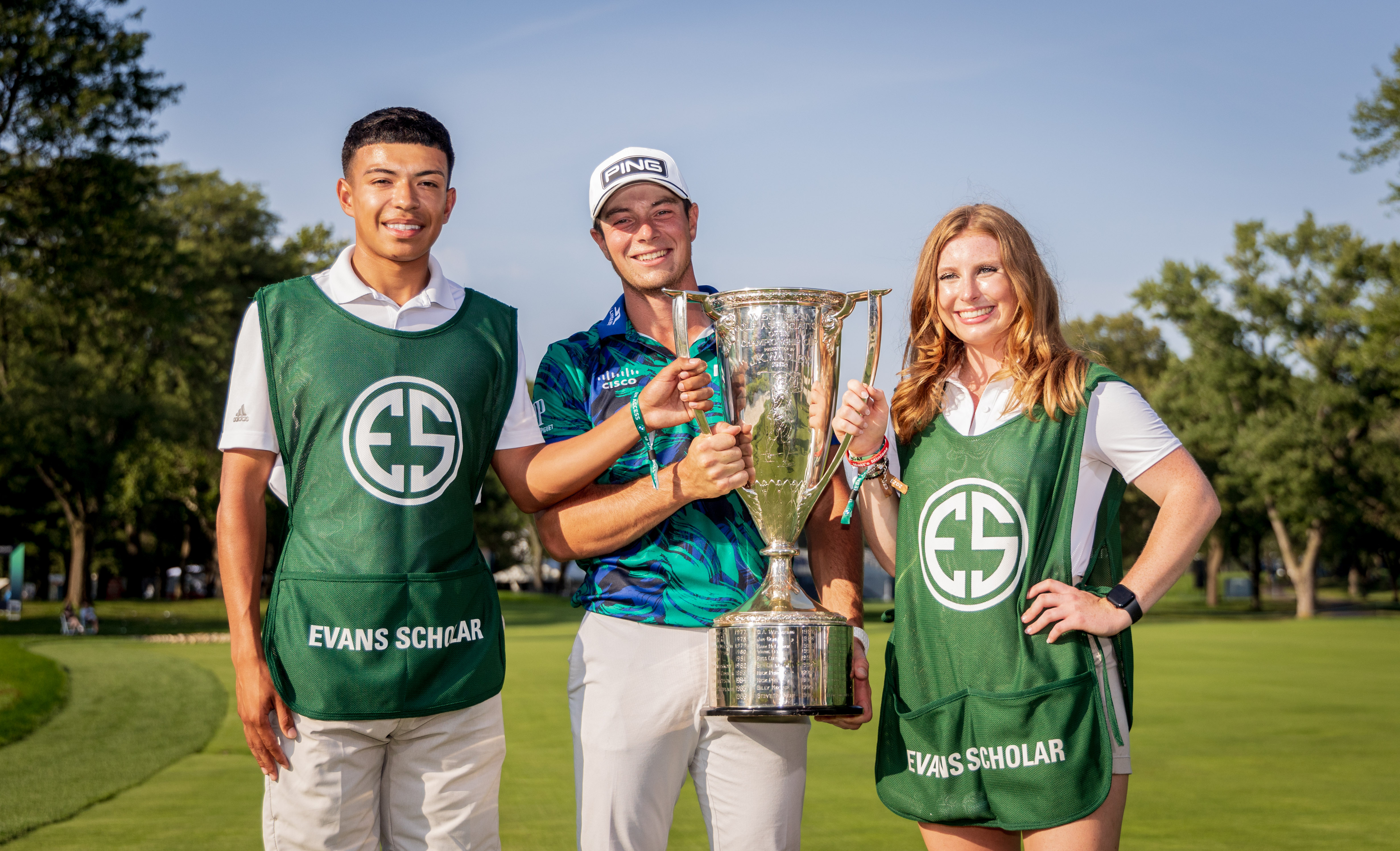 2023 BMW Championship winner Viktor Hovland holds the J.K. Wadley Trophy alongside caddies with the Evans Scholars Foundation following his victory at the 2023 BMW Championship at Olympia Fields Country Club in Olympia Fields, IL on August 20, 2023.